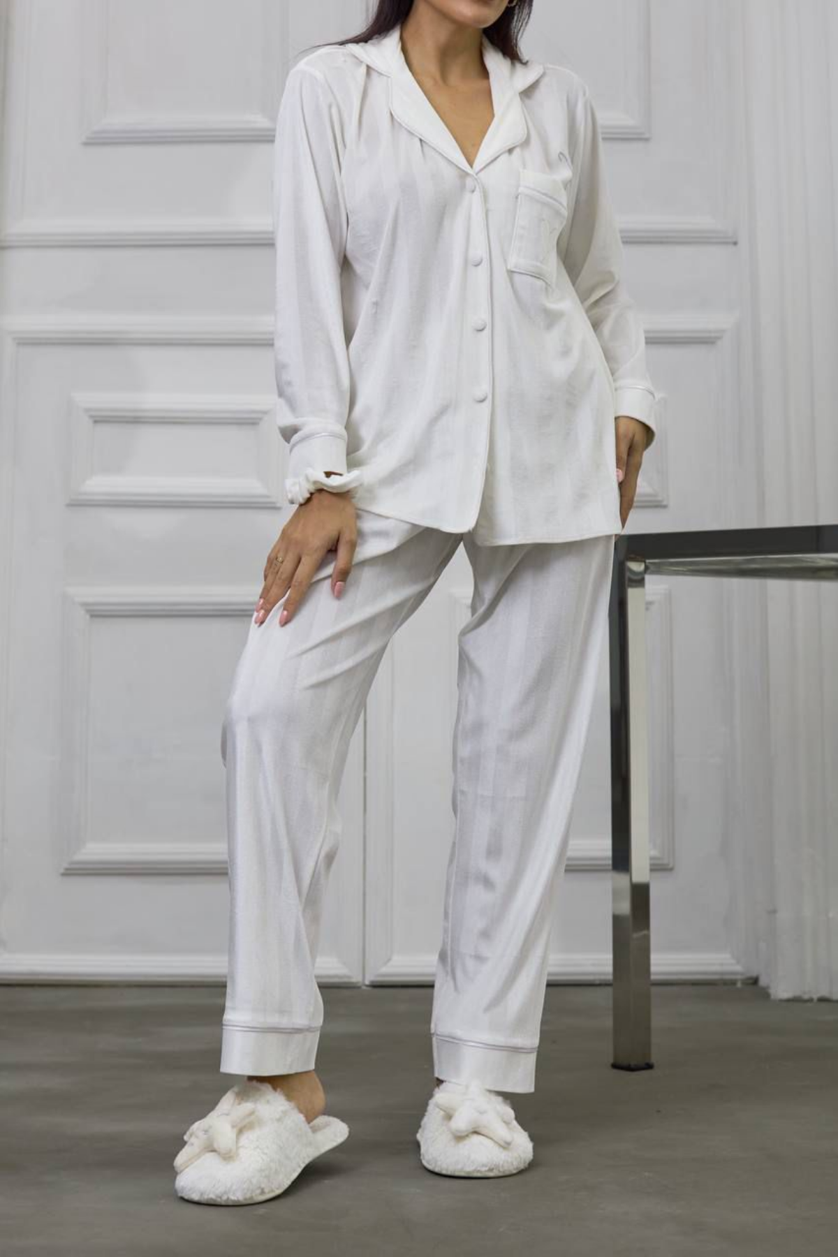 Gizotti Beyaz Gofreli Kalp Nakışlı Uzun Kadife Pijama Takımı ile evinizde bir kraliçe gibi hissedeceksiniz.